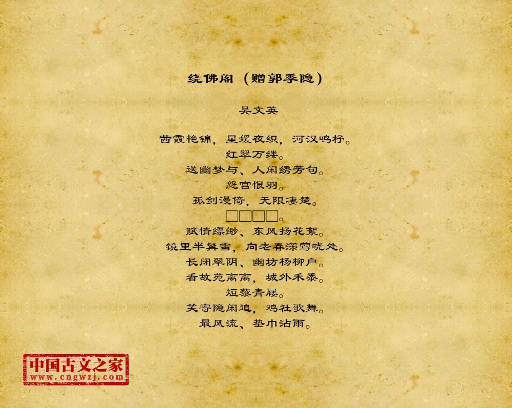 茜霞艳锦,星媛夜织,河汉鸣杼。红翠万缕。送幽梦与、人闲绣芳句。怨宫恨羽。孤剑漫倚,无限凄楚。□□□□。赋情缥缈、东风扬花絮。镜里半髯雪,向老春深莺晓处。长闭翠阴、幽坊杨柳户。看故苑离离,城外禾黍。短藜青屦。笑寄隐闲追,鸡社歌舞。最风流、垫巾沾雨。