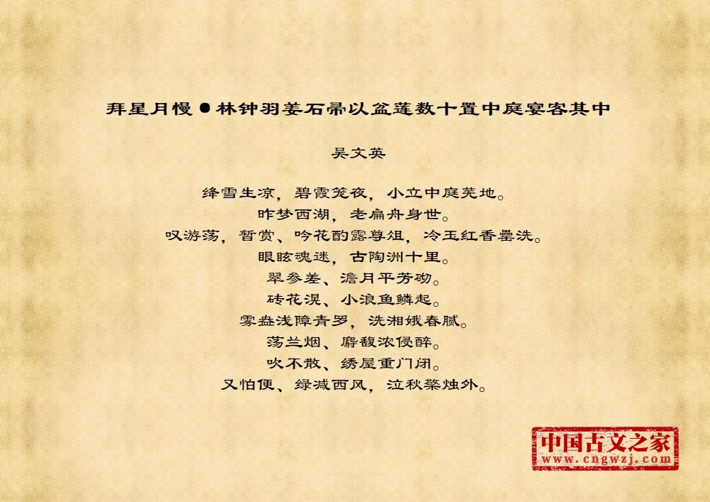 拜星月慢·林钟羽姜石帚以盆莲数十置中庭宴客其中