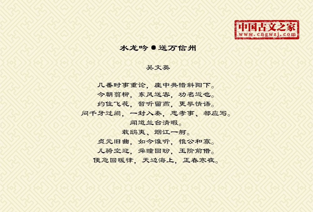 几番时事重论,座中共惜斜阳下。今朝翦柳,东风送客,功名近也。约住飞花,暂听留燕,更攀情语。问千牙过阙,一封入奏,忠孝事、都应写。闻道兰台清暇。载鸱夷、烟江一舸。贞元旧曲,如今谁听,惟公和寡。儿骑空迎,舜瞳回盼,玉阶前借。便急回暖律,天边海上,正春寒夜。
