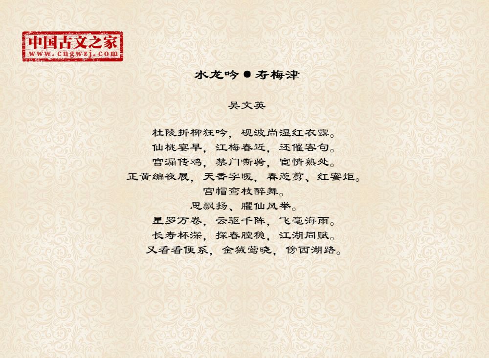 杜陵折柳狂吟,砚波尚湿红衣露。仙桃宴早,江梅春近,还催客句。宫漏传鸡,禁门嘶骑,宦情熟处。正黄编夜展,天香字暖,春葱剪、红蜜炬。宫帽鸾枝醉舞。思飘扬、臞仙风举。星罗万卷,云驱千阵,飞毫海雨。长寿杯深,探春腔稳,江湖同赋。又看看便系,金狨莺晓,傍西湖路。