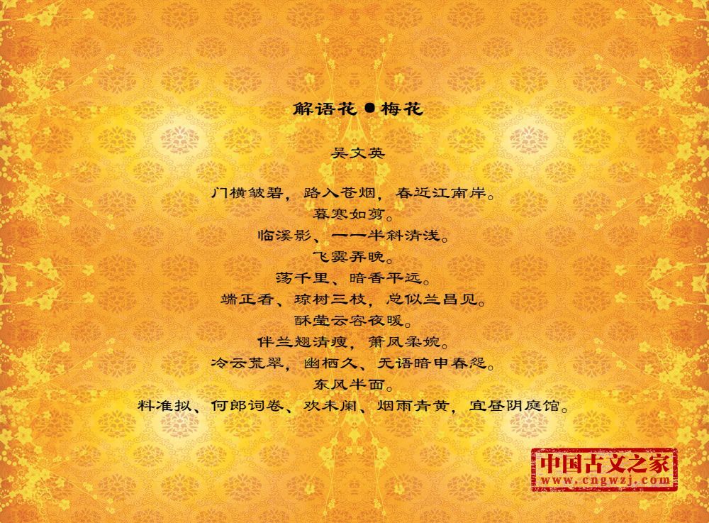 门横皱碧,路入苍烟,春近江南岸。暮寒如剪。临溪影、一一半斜清浅。飞霙弄晚。荡千里、暗香平远。端正看、琼树三枝,总似兰昌见。酥莹云容夜暖。伴兰翘清瘦,箫凤柔婉。冷云荒翠,幽栖久、无语暗申春怨。东风半面。料准拟、何郎词卷、欢未阑、烟雨青黄,宜昼阴庭馆。