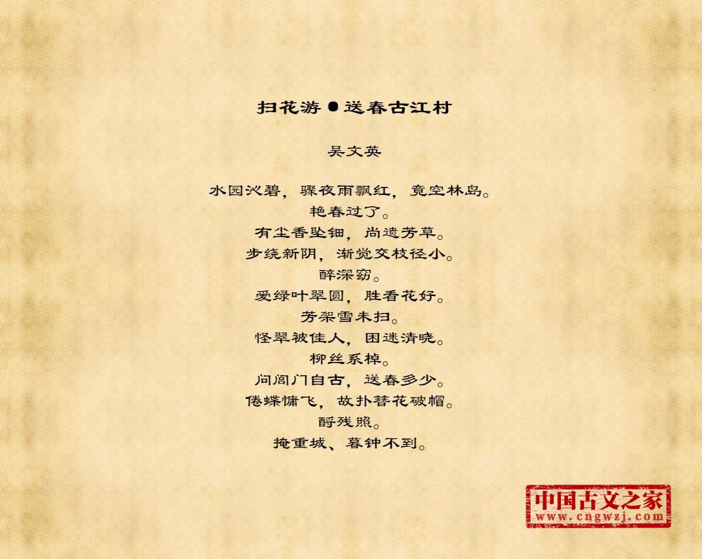 水园沁碧,骤夜雨飘红,竟空林岛。艳春过了。有尘香坠钿,尚遗芳草。步绕新阴,渐觉交枝径小。醉深窈。爱绿叶翠圆,胜看花好。芳架雪未扫。怪翠被佳人,困迷清晓。柳丝系棹。问闾门自古,送春多少。倦蝶慵飞,故扑簪花破帽。酹残照。掩重城、暮钟不到。