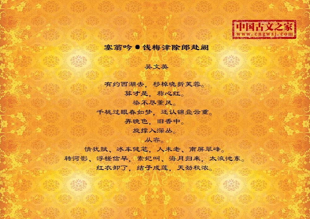 有约西湖去,移棹晓折芙蓉。算才是,称心红。染不尽薰风。千桃过眼春如梦,还认锦叠云重。弄晚色,旧香中。旋撑入深丛。从容。情犹赋、冰车健笔,人未老、南屏翠峰。转河影、浮槎信早,素妃叫、海月归来,太液池东。红衣卸了,结子成莲,天劲秋浓。