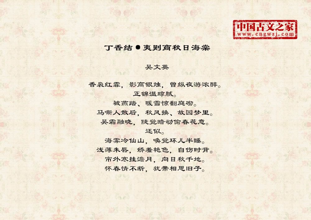 吴文英(约1200~1260),字君特,号梦窗,晚年又号觉翁,四明(今浙江宁波)人。原出翁姓,后出嗣吴氏。与贾似道友善。有《梦窗词集》一部,存词三百四