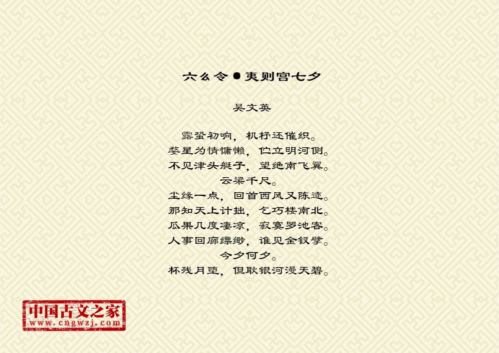 露蛩初响,机杼还催织。婺星为情慵懒,伫立明河侧。不见津头艇子,望绝南飞翼。云梁千尺。尘缘一点,回首西风又陈迹。那知天上计拙,乞巧楼南北。瓜果几度凄凉,寂寞罗池客。人事回廊缥缈,谁见金钗擘。今夕何夕。杯残月堕,但耿银河漫天碧。