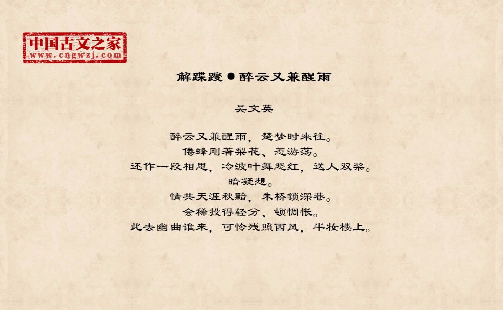 醉云又兼醒雨,楚梦时来往。倦蜂刚著梨花、惹游荡。还作一段相思,冷波叶舞愁红,送人双桨。暗凝想。情共天涯秋黯,朱桥锁深巷。会稀投得轻分、顿惆怅。此去幽曲谁来,可怜残照西风,半妆楼上。