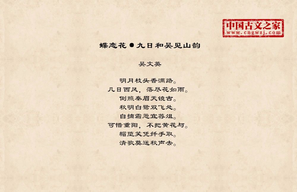 明月枝头香满路。几日西风,落尽花如雨。倒照秦眉天镜古。秋明白鹭双飞处。自摘霜葱宜荐俎。可惜重阳,不把黄花与。帽堕笑凭纤手取。清歌莫送秋声去。
