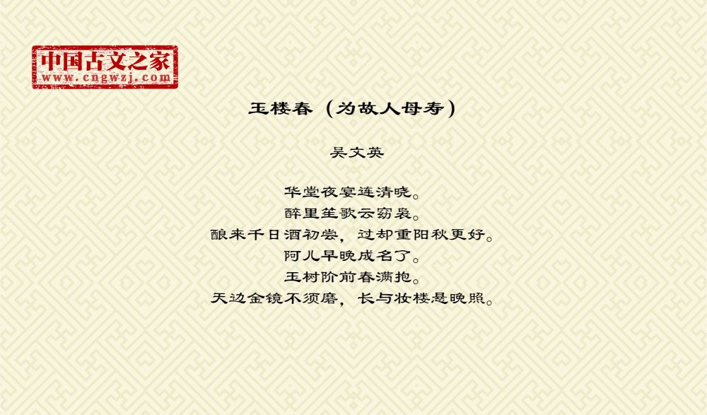 华堂夜宴连清晓。醉里笙歌云窈袅。酿来千日酒初尝,过却重阳秋更好。阿儿早晚成名了。玉树阶前春满抱。天边金镜不须磨,长与妆楼悬晚照。