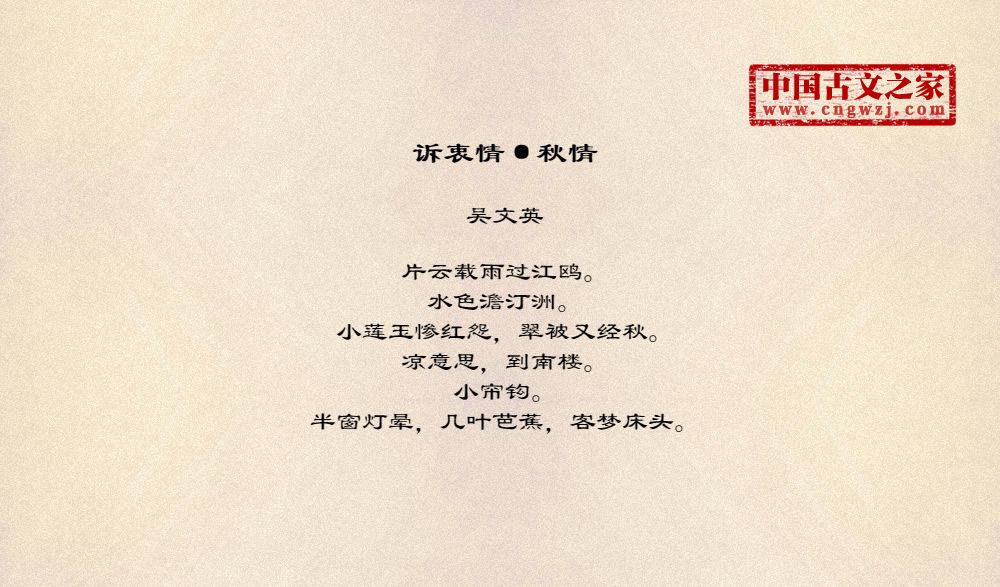 片云载雨过江鸥。水色澹汀洲。小莲玉惨红怨,翠被又经秋。凉意思,到南楼。小帘钩。半窗灯晕,几叶芭蕉,客梦床头。