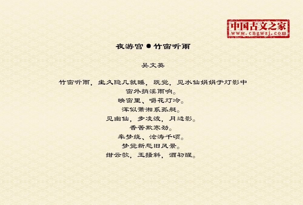 竹窗听雨,坐久隐几就睡,既觉,见水仙娟娟于灯影中 窗外捎溪雨响。映窗里、嚼花灯冷。浑似萧湘系孤艇。见幽仙,步凌波,月边影。 香苦欺寒劲。牵梦绕、沧涛千顷。梦觉新愁旧风景。绀云欹,玉搔斜,酒初醒。[1]