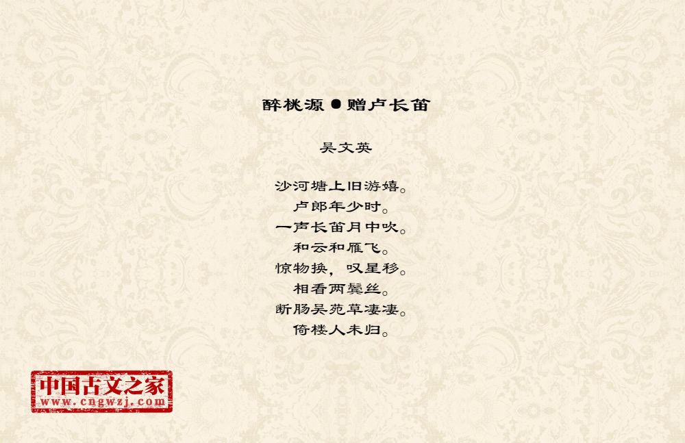 沙河塘上旧游嬉。卢郎年少时。一声长笛月中吹。和云和雁飞。惊物换,叹星移。相看两鬓丝。断肠吴苑草凄凄。倚楼人未归。