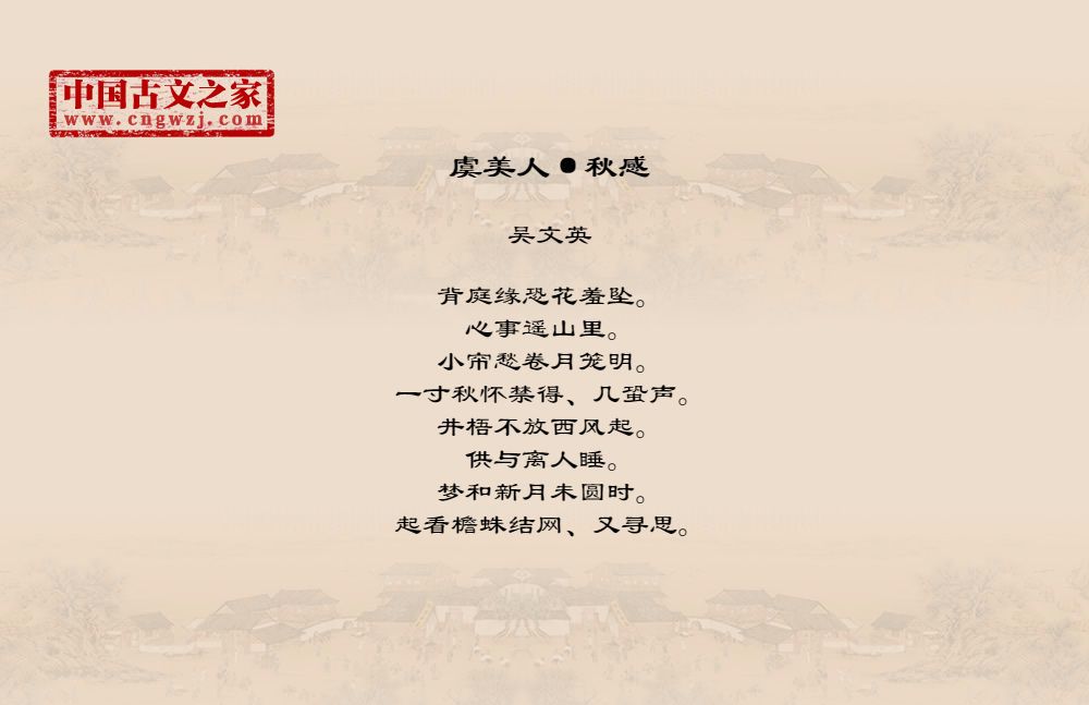 背庭缘恐花羞坠。心事遥山里。小帘愁卷月笼明。一寸秋怀禁得、几蛩声。井梧不放西风起。供与离人睡。梦和新月未圆时。起看檐蛛结网、又寻思。