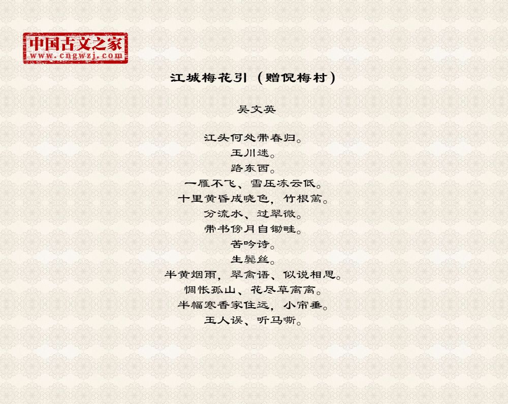 江头何处带春归。玉川迷。路东西。一雁不飞、雪压冻云低。十里黄昏成晓色,竹根篱。分流水、过翠微。带书傍月自锄畦。苦吟诗。生鬓丝。半黄烟雨,翠禽语、似说相思。惆怅孤山、花尽草离离。半幅寒香家住远,小帘垂。玉人误、听马嘶。