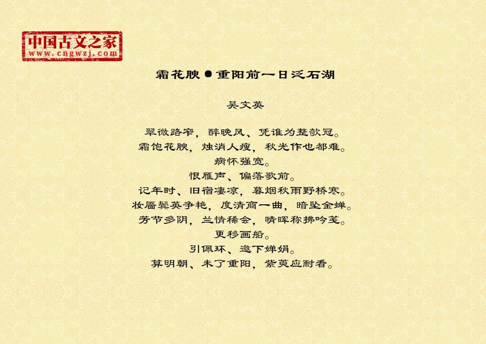《霜花腴·重阳前一日泛石湖》由吴文英创作