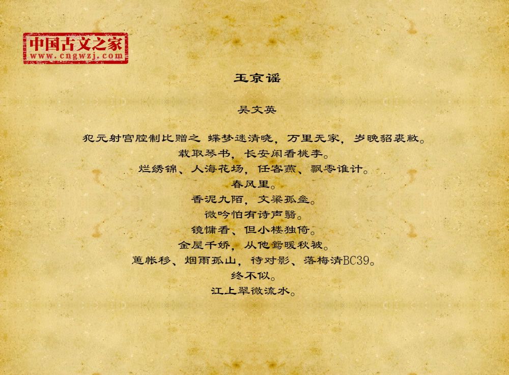 犯元射宫腔制比赠之 蝶梦迷清晓,万里无家,岁晚貂裘敝。载取琴书,长安闲看桃李。烂绣锦、人海花场,任客燕、飘零谁计。春风里。香泥九陌,文梁孤垒。微吟怕有诗声翳。镜慵看、但小楼独倚。金屋千娇,从他鸳暖秋被。蕙帐移、烟雨孤山,待对影、落梅清BC39。终不似。江上翠微流水。