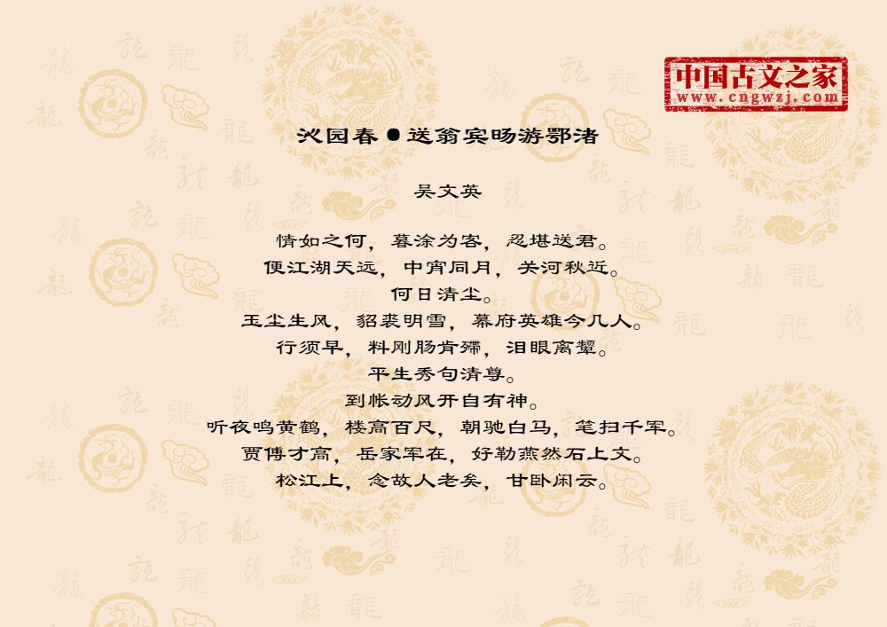 情如之何,暮涂为客,忍堪送君。便江湖天远,中宵同月,关河秋近。何日清尘。玉尘生风,貂裘明雪,幕府英雄今几人。行须早,料刚肠肯殢,泪眼离颦。平生秀句清尊。到帐动风开自有神。听夜鸣黄鹤,楼高百尺,朝驰白马,笔扫千军。贾傅才高,岳家军在,好勒燕然石上文。松江上,念故人老矣,甘卧闲云。