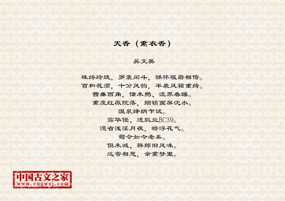 珠络玲珑,罗囊闲斗,酥怀暖麝相倚。百和花须,十分风韵,半袭凤箱重绮。茜垂西角,慵未揭、流苏春睡。熏度红薇院落,烟锁画屏沈水。温泉绛绡乍试。露华侵、透肌兰BC39。漫省浅溪月夜,暗浮花气。荀令如今老矣。但未减、韩郎旧风味。远寄相思,余熏梦里。