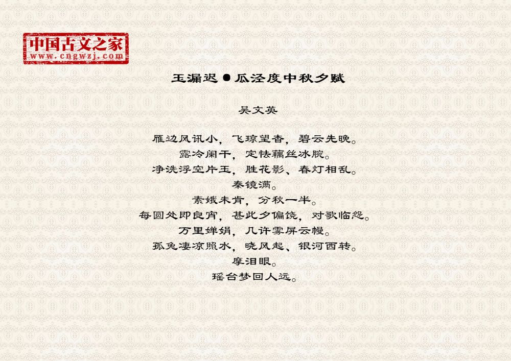 雁边风讯小,飞琼望杳,碧云先晚。露冷阑干,定怯藕丝冰腕。净洗浮空片玉,胜花影、春灯相乱。秦镜满。素娥未肯,分秋一半。每圆处即良宵,甚此夕偏饶,对歌临怨。万里婵娟,几许雾屏云幔。孤兔凄凉照水,晓风起、银河西转。摩泪眼。瑶台梦回人远。