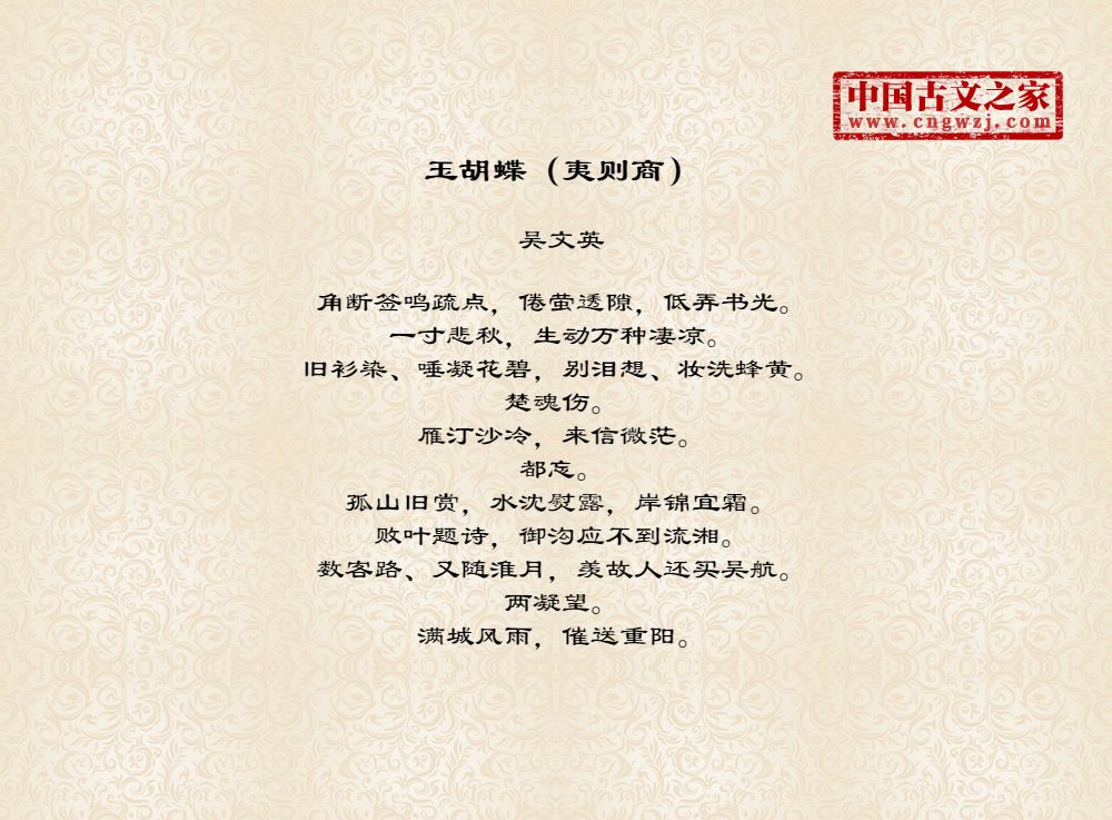 吴文英(约1200~1260),字君特,号梦窗,晚年又号觉翁,四明(今浙江宁波)人。原出翁姓,后出嗣吴氏。与贾似道友善。有《梦窗词集》一部,存词三百四