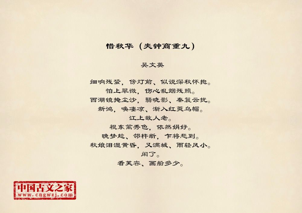 细响残蛩,傍灯前、似说深秋怀抱。怕上翠微,伤心乱烟残照。西湖镜掩尘沙,翳晓影、秦鬟云扰。新鸿,唤凄凉、渐入红萸乌帽。江上故人老。视东篱秀色,依然娟好。晚梦趁、邻杵断,乍将愁到。秋娘泪湿黄昏,又满城、雨轻风小。闲了。看芙容、画船多少。