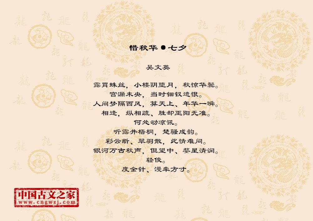露罥蛛丝,小楼阴堕月,秋惊华鬓。宫漏未央,当时钿钗遗恨。人间梦隔西风,算天上、年华一瞬。相逢,纵相疏、胜却巫阳无准。何处动凉讯。听露井梧桐,楚骚成韵。彩云断、翠羽散,此情难问。银河万古秋声,但望中、婺星清润。轻俊。度金针、漫牵方寸。
