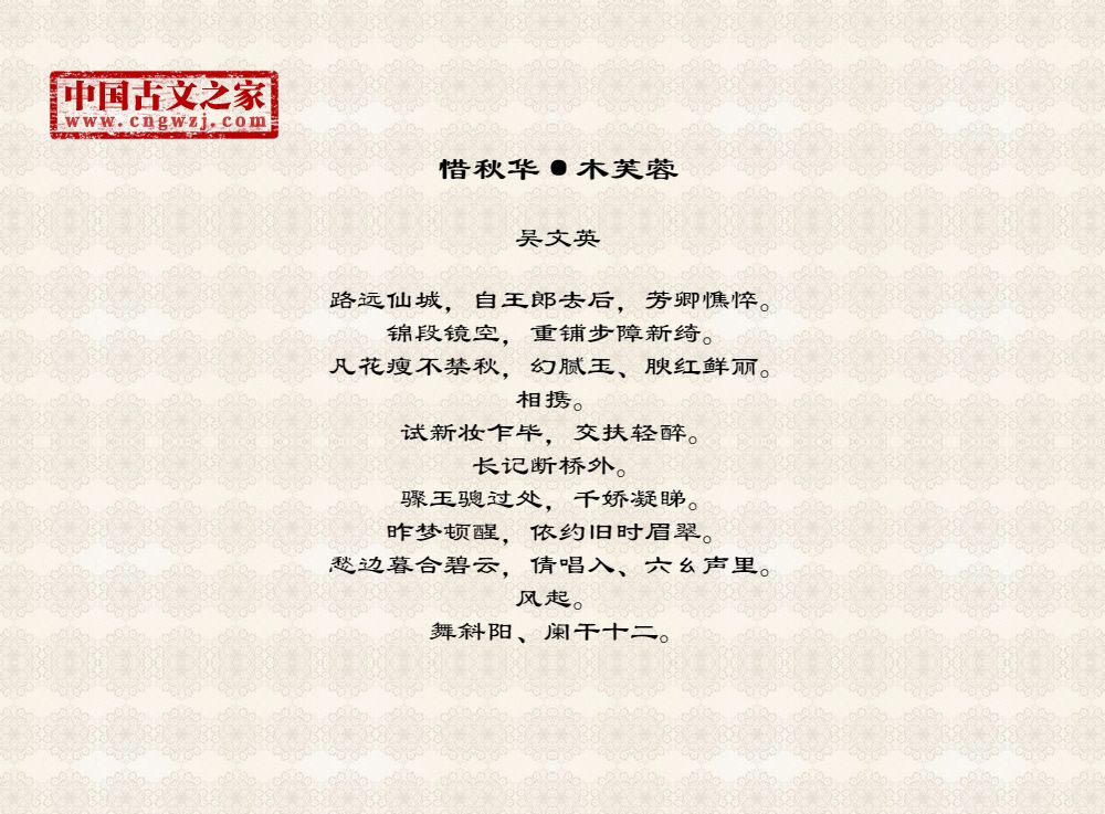 路远仙城,自王郎去后,芳卿憔悴。锦段镜空,重铺步障新绮。凡花瘦不禁秋,幻腻玉、腴红鲜丽。相携。试新妆乍毕,交扶轻醉。长记断桥外。骤玉骢过处,千娇凝睇。昨梦顿醒,依约旧时眉翠。愁边暮合碧云,倩唱入、六幺声里。风起。舞斜阳、阑干十二。