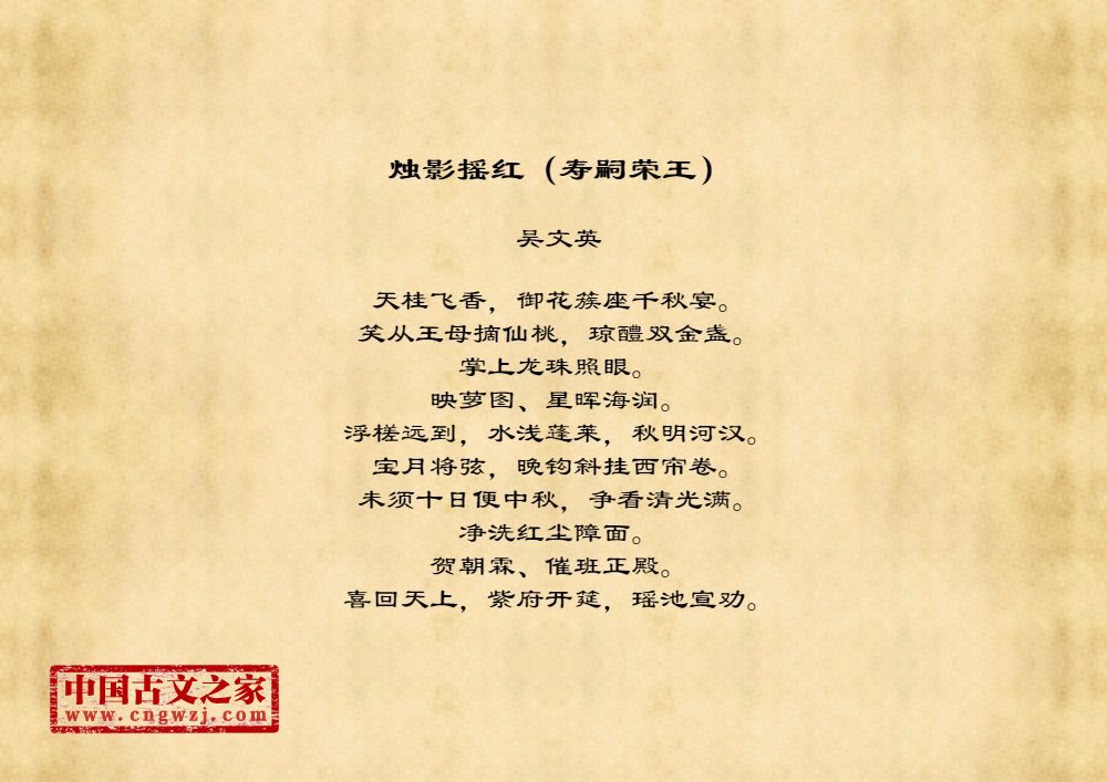 天桂飞香,御花簇座千秋宴。笑从王母摘仙桃,琼醴双金盏。掌上龙珠照眼。映萝图、星晖海润。浮槎远到,水浅蓬莱,秋明河汉。宝月将弦,晚钩斜挂西帘卷。未须十日便中秋,争看清光满。净洗红尘障面。贺朝霖、催班正殿。喜回天上,紫府开筵,瑶池宣劝。