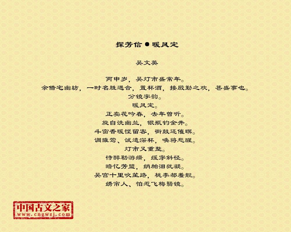 丙申岁,吴灯市盛常年。余借宅幽坊,一时名胜遇合,置杯酒,接殷勤之欢,甚盛事也。分镜字韵。暖风定。正卖花吟春,去年曾听。旋自洗幽兰,银瓶钓金井。斗窗香暖悭留客,街鼓还催暝。调雏莺、试遣深杯,唤将愁醒。灯市又重整。待醉勒游缰,缓穿斜径。暗忆芳盟,绡帕泪犹凝。吴宫十里吹笙路,桃李都羞靓。绣帘人、怕惹飞梅翳镜。