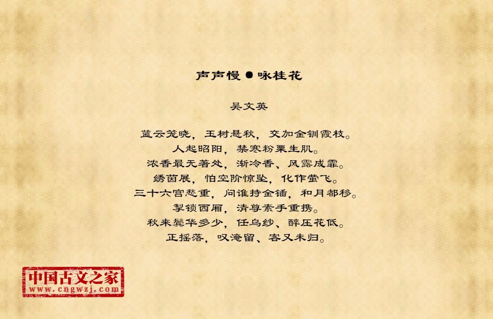 蓝云笼晓,玉树悬秋,交加金钏霞枝。人起昭阳,禁寒粉粟生肌。浓香最无著处,渐冷香、风露成霏。绣茵展,怕空阶惊坠,化作萤飞。三十六宫愁重,问谁持金锸,和月都移。掣锁西厢,清尊素手重携。秋来鬓华多少,任乌纱、醉压花低。正摇落,叹淹留、客又未归。