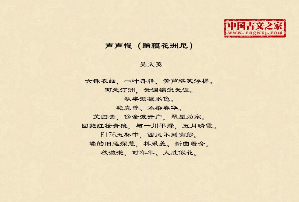 六铢衣细,一叶舟轻,黄芦堪笑浮槎。何处汀洲,云澜锦浪无涯。秋姿澹凝水色。艳真香、不染春华。笑归去,傍金波开户,翠屋为家。回施红妆青镜,与一川平绿,五月晴霞。E176玉杯中,西风不到窗纱。端的旧莲深薏,料采菱、新曲羞夸。秋潋滟,对年年、人胜似花。