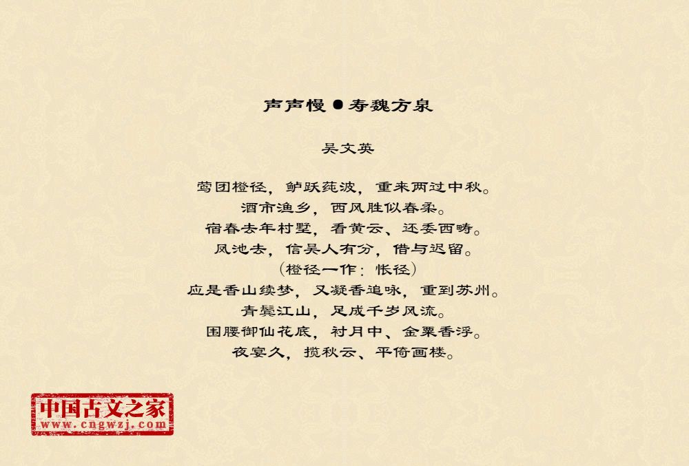 莺团橙径,鲈跃莼波,重来两过中秋。酒市渔乡,西风胜似春柔。宿春去年村墅,看黄云、还委西畴。凤池去,信吴人有分,借与迟留。(橙径一作:怅径)应是香山续梦,又凝香追咏,重到苏州。青鬓江山,足成千岁风流。围腰御仙花底,衬月中、金粟香浮。夜宴久,揽秋云、平倚画楼。