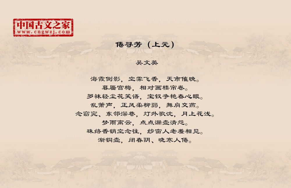 海霞倒影,空雾飞香,天市催晚。暮靥宫梅,相对画楼帘卷。罗袜轻尘花笑语,宝钗争艳春心眼。乱箫声,正风柔柳弱,舞肩交燕。念窈窕、东邻深巷,灯外歌沈,月上花浅。梦雨离云,点点漏壶清怨。珠络香销空念往,纱窗人老羞相见。渐铜壶,闭春阴、晓寒人倦。