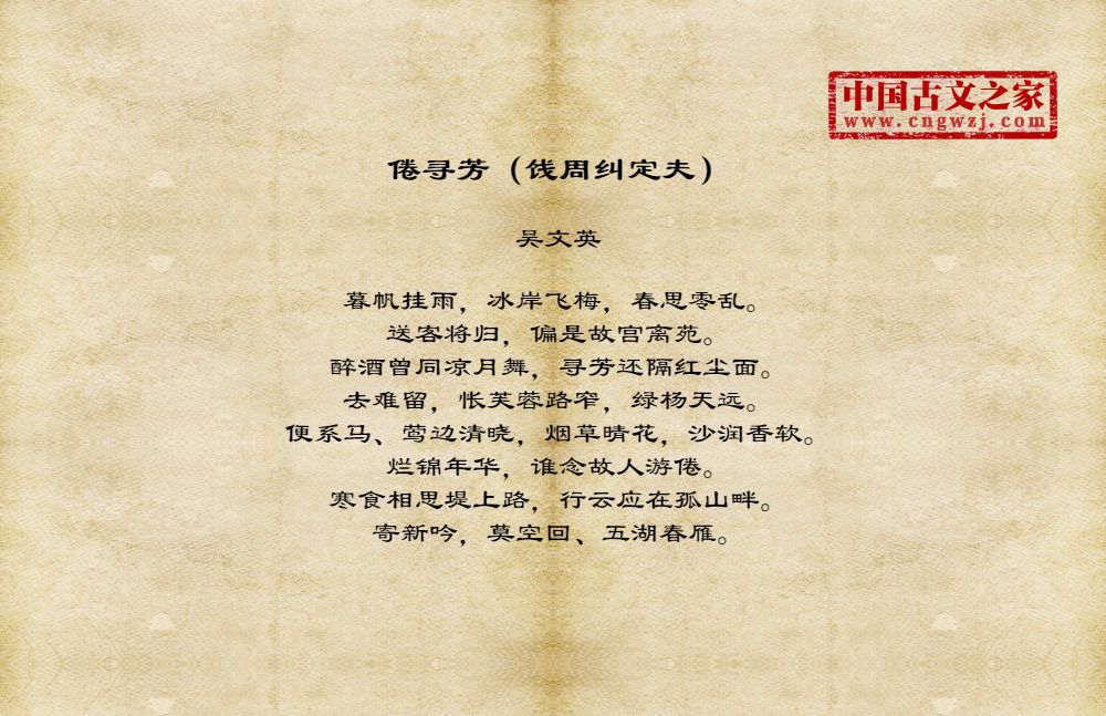 暮帆挂雨,冰岸飞梅,春思零乱。送客将归,偏是故宫离苑。醉酒曾同凉月舞,寻芳还隔红尘面。去难留,怅芙蓉路窄,绿杨天远。便系马、莺边清晓,烟草晴花,沙润香软。烂锦年华,谁念故人游倦。寒食相思堤上路,行云应在孤山畔。寄新吟,莫空回、五湖春雁。