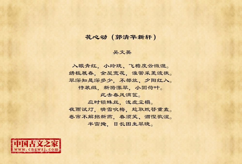 入眼青红,小玲珑、飞檐度云微湿。绣槛展春,金屋宽花,谁管采菱波狭。翠深知是深多少,不都放、夕阳红入。待装缀,新漪涨翠,小圜荷叶。此去春风满箧。应时锁蛛丝,浅虚尘榻。夜雨试灯,晴雪吹梅,趁取玳簪重盍。卷帘不解招新燕,春须笑、酒慳歌涩。半窗掩,日长困生翠睫。