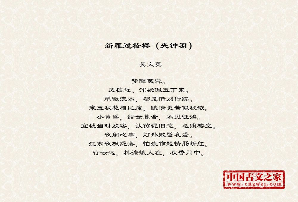梦醒芙蓉。风檐近、浑疑佩玉丁东。翠微流水,都是惜别行踪。宋玉秋花相比瘦,赋情更苦似秋浓。小黄昏,绀云暮合,不见征鸿。宜城当时放客,认燕泥旧迹,返照楼空。夜阑心事,灯外败壁哀蛩。江寒夜枫怨落,怕流作题情肠断红。行云远,料澹蛾人在,秋香月中。