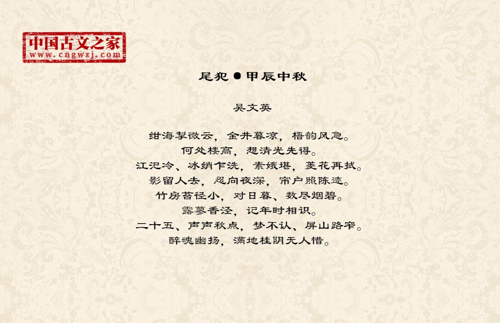 绀海掣微云,金井暮凉,梧韵风急。何处楼高,想清光先得。江汜冷、冰绡乍洗,素娥堪,菱花再拭。影留人去,忍向夜深,帘户照陈迹。竹房苔径小,对日暮、数尽烟碧。露蓼香泾,记年时相识。二十五、声声秋点,梦不认、屏山路窄。醉魂幽扬,满地桂阴无人惜。