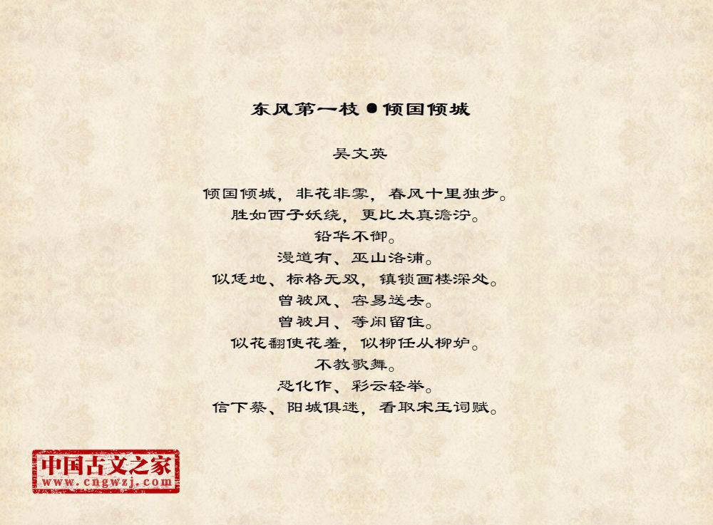 倾国倾城,非花非雾,春风十里独步。胜如西子妖绕,更比太真澹泞。铅华不御。漫道有、巫山洛浦。似恁地、标格无双,镇锁画楼深处。曾被风、容易送去。曾被月、等闲留住。似花翻使花羞,似柳任从柳妒。不教歌舞。恐化作、彩云轻举。信下蔡、阳城俱迷,看取宋玉词赋。