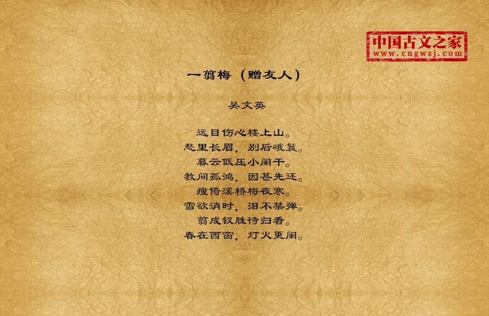 远目伤心楼上山。愁里长眉,别后峨鬟。暮云低压小阑干。教问孤鸿,因甚先还。瘦倚溪桥梅夜寒。雪欲消时,泪不禁弹。翦成钗胜待归看。春在西窗,灯火更阑。