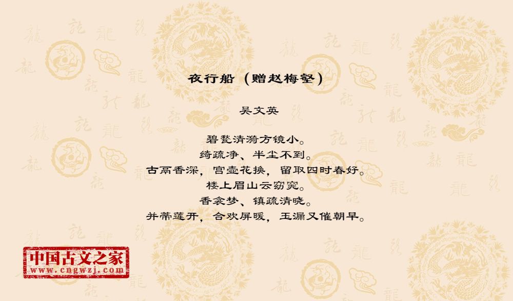 吴文英(约1200~1260),字君特,号梦窗,晚年又号觉翁,四明(今浙江宁波)人。原出翁姓,后出嗣吴氏。与贾似道友善。有《梦窗词集》一部,存词三百四