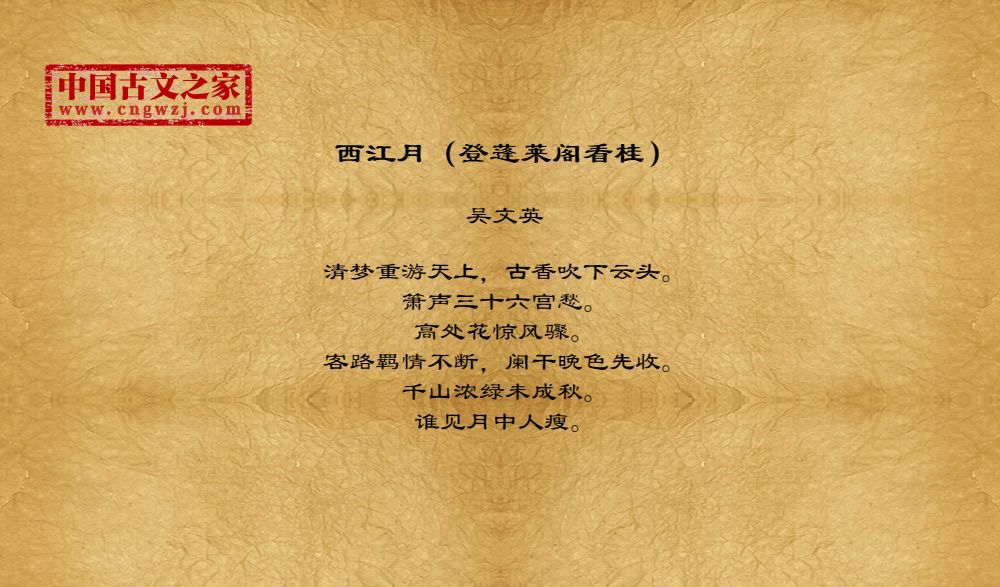 清梦重游天上,古香吹下云头。箫声三十六宫愁。高处花惊风骤。客路羁情不断,阑干晚色先收。千山浓绿未成秋。谁见月中人瘦。