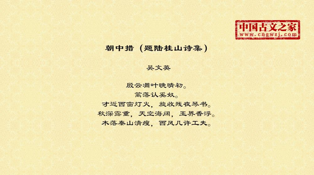 殷云凋叶晚晴初。篱落认奚奴。才近西窗灯火,旋收残夜琴书。秋深露重,天空海阔,玉界香浮。木落秦山清瘦,西风几许工夫。