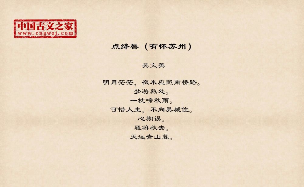 明月茫茫,夜来应照南桥路。梦游熟处。一枕啼秋雨。可惜人生,不向吴城住。心期误。雁将秋去。天远青山暮。