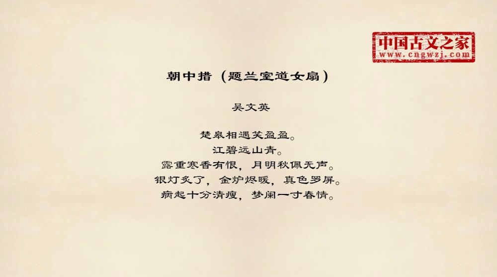 楚皋相遇笑盈盈。江碧远山青。露重寒香有恨,月明秋佩无声。银灯炙了,金炉烬暖,真色罗屏。病起十分清瘦,梦阑一寸春情。