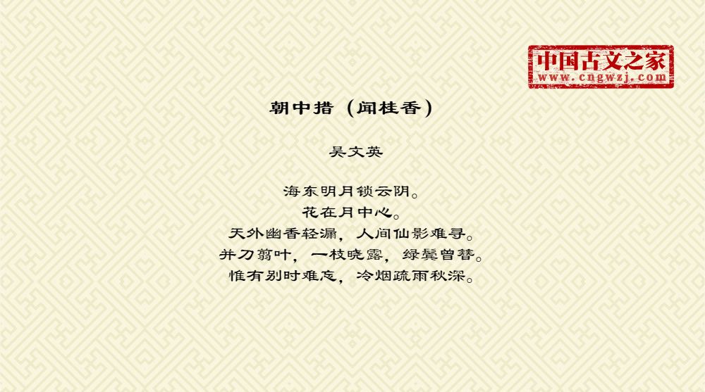 海东明月锁云阴。花在月中心。天外幽香轻漏,人间仙影难寻。并刀翦叶,一枝晓露,绿鬓曾簪。惟有别时难忘,冷烟疏雨秋深。