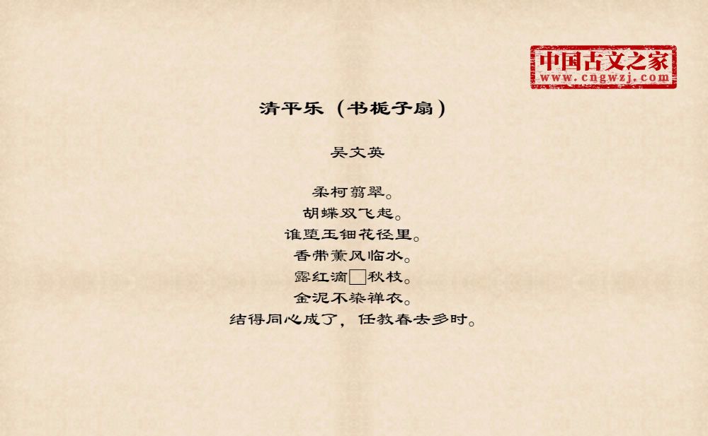 柔柯翦翠。胡蝶双飞起。谁堕玉钿花径里。香带薰风临水。露红滴□秋枝。金泥不染禅衣。结得同心成了,任教春去多时。
