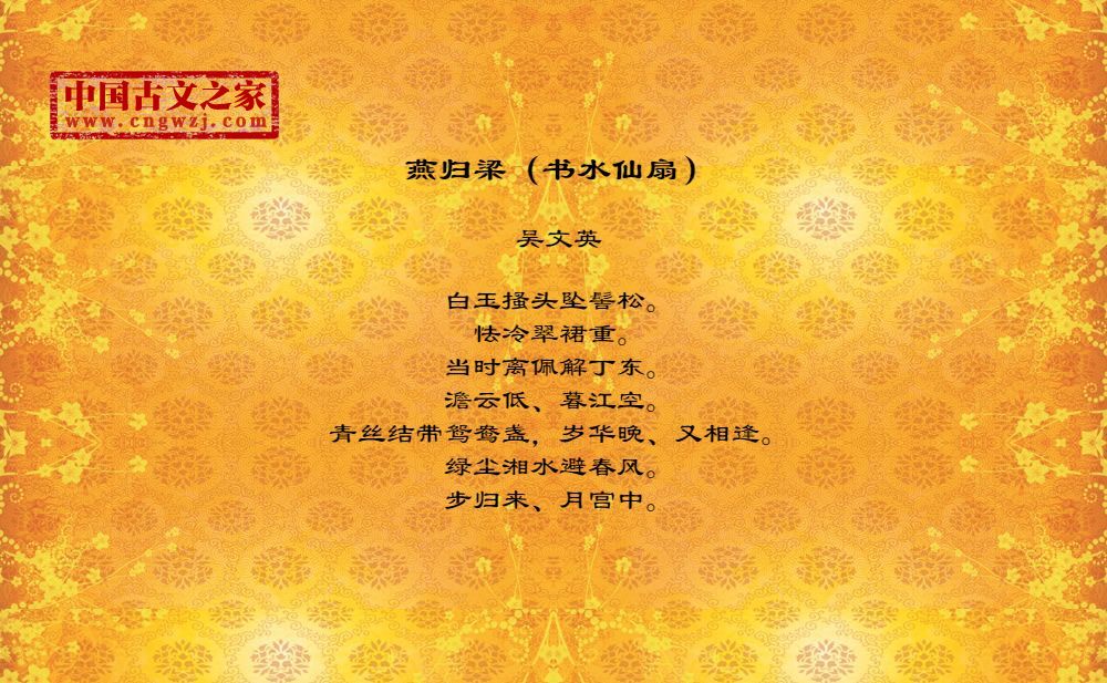 白玉搔头坠髻松。怯冷翠裙重。当时离佩解丁东。澹云低、暮江空。青丝结带鸳鸯盏,岁华晚、又相逢。绿尘湘水避春风。步归来、月宫中。