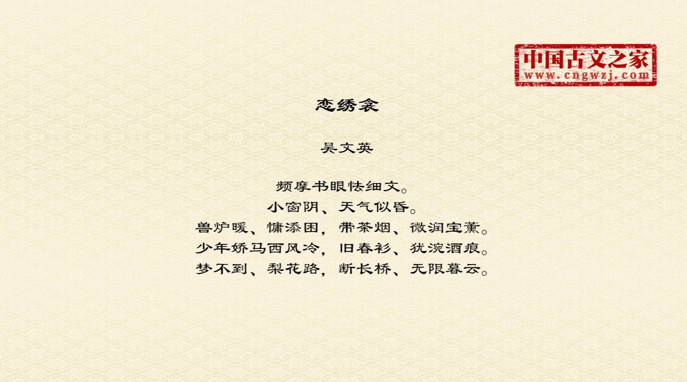 频摩书眼怯细文。小窗阴、天气似昏。兽炉暖、慵添困,带茶烟、微润宝薰。少年娇马西风冷,旧春衫、犹涴酒痕。梦不到、梨花路,断长桥、无限暮云。