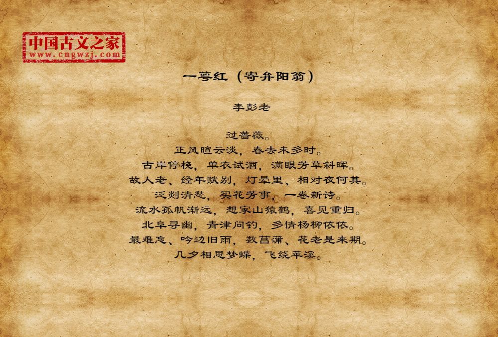 过蔷薇。正风暄云淡,春去未多时。古岸停桡,单衣试酒,满眼芳草斜晖。故人老、经年赋别,灯晕里、相对夜何其。泛剡清愁,买花芳事,一卷新诗。流水孤帆渐远,想家山猿鹤,喜见重归。北阜寻幽,青津问钓,多情杨柳依依。最难忘、吟边旧雨,数菖蒲、花老是来期。几夕相思梦蝶,飞绕苹溪。