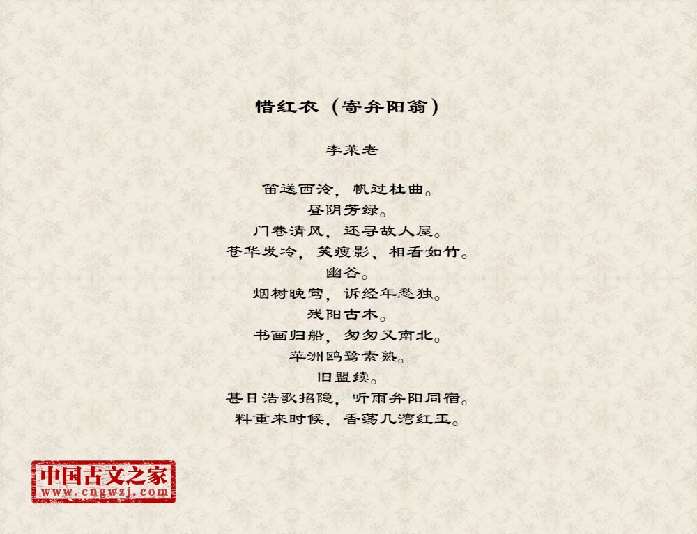 笛送西泠,帆过杜曲。昼阴芳绿。门巷清风,还寻故人屋。苍华发冷,笑瘦影、相看如竹。幽谷。烟树晚莺,诉经年愁独。残阳古木。书画归船,匆匆又南北。苹洲鸥鹭素熟。旧盟续。甚日浩歌招隐,听雨弁阳同宿。料重来时候,香荡几湾红玉。
