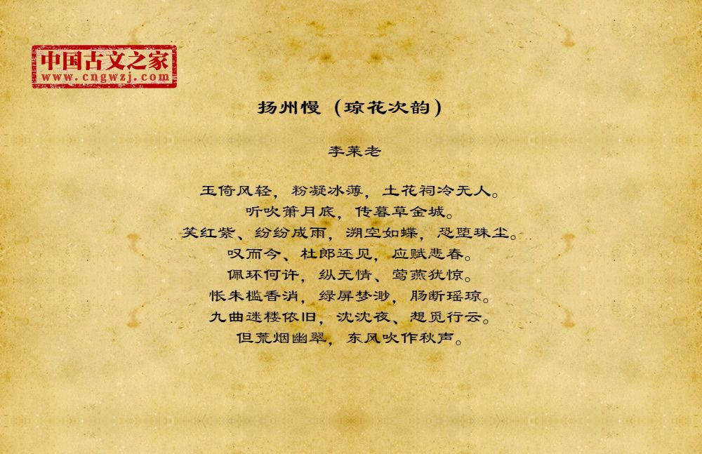 玉倚风轻,粉凝冰薄,土花祠冷无人。听吹箫月底,传暮草金城。笑红紫、纷纷成雨,溯空如蝶,恐堕珠尘。叹而今、杜郎还见,应赋悲春。佩环何许,纵无情、莺燕犹惊。怅朱槛香消,绿屏梦渺,肠断瑶琼。九曲迷楼依旧,沈沈夜、想觅行云。但荒烟幽翠,东风吹作秋声。